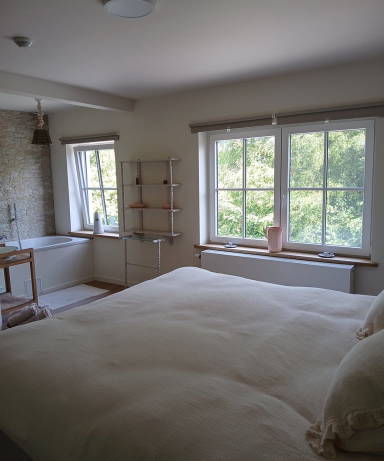 Découvrez notre chambre d'appoint donnant sur la cour à La Maison d'Alfred, un espace tranquille et inspirant pour travailler ou se reposer. Idéale pour une escapade professionnelle ou un moment de détente, cette chambre allie confort et charme rustique.